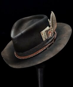 “Distressed Fedora Adorned With Scarf Feather And Rope” is hand-distressed, hand-dyed, and hand-torched, ensuring no two share the same color or design. Each piece is uniquely imperfect, with subtle variations from product images.