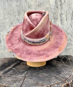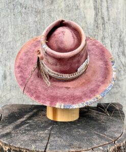 “Mulled Wine Vintage Felt Wide Brim Hat” is hand-distressed, hand-dyed, and hand-torched, ensuring no two share the same color or design. Each piece is uniquely imperfect, with subtle variations from product images.