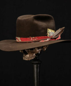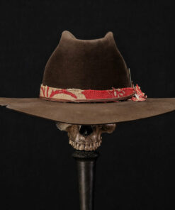 It has a low profile Gus creased crown that is 4.75″ in the back and slopes to 4.25″ in the front. The 3.75″ brim has a small pencil curl on the sides and a nice slope in the front and back. It is topped off with an antique looking leather hat band. We really like this one with its unique look and versatility.